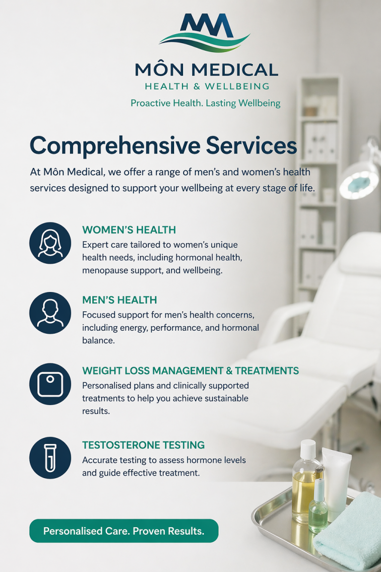 At Môn Medical, we provide safe, evidence-based care tailored to your individual needs. Our experienced team is committed to offering expert guidance and compassionate support, ensuring your health is managed with confidence and clarity. We combine strong clinical expertise with a genuine dedication to helping you feel well, supported, and empowered at every stage of life